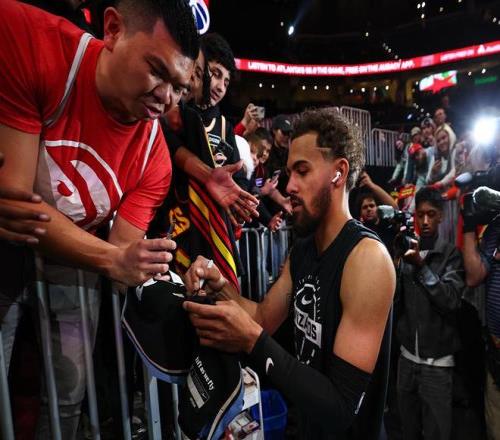 同時(shí)特雷楊賽后仍不忘為現(xiàn)場觀戰(zhàn)的老鷹隊(duì)球迷簽名、合照留念,并且通過視頻方式為中國球迷送上新年祝福。