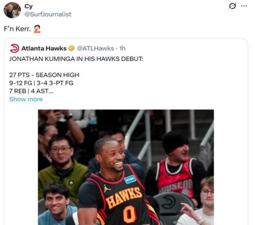 面對庫明加這樣的首秀表現(xiàn),部分勇士球迷直接轉(zhuǎn)發(fā)其表現(xiàn)怒噴昔日不愿意使用庫明加的科爾。