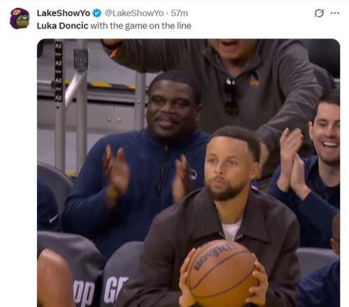 湖人媒體LakerShowYo曬出庫里在場邊的一段視頻后嘲諷東契奇在關鍵時刻登場就如同場下的庫里一般。