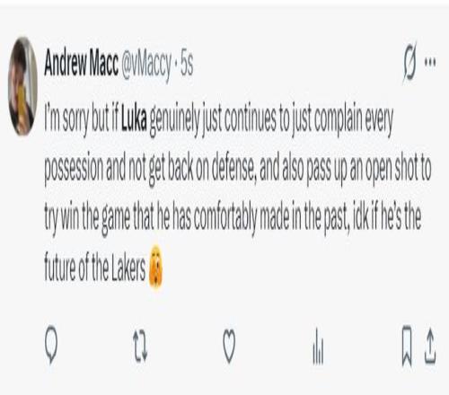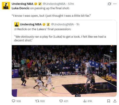 這場比賽盧卡-東契奇錯失了一個絕佳的三分出手機會,他居然將這個空位機會傳給了底角更遠的詹姆斯,結果詹姆斯扭著身子出手不中。