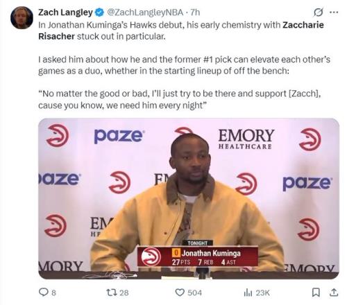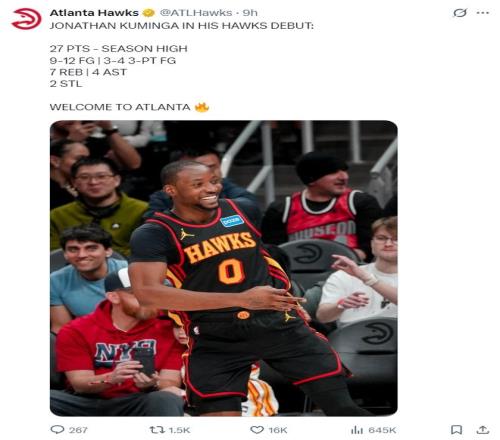 這場比賽是喬納森-庫明加老鷹生涯的首秀,此前勇士用庫明加+希爾德?lián)Q走了波爾津吉斯,此役庫明加全場比賽24分鐘,12中9,三分4中3,罰球7中6,拿到27分7籃板4助攻2搶斷,命中率75%,三分命中率75%,真實(shí)命中率89.5%,正負(fù)值+16。