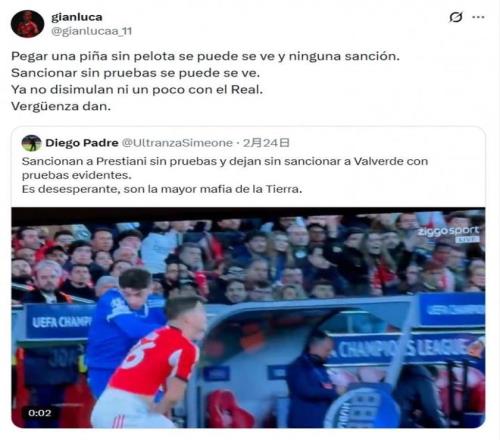 本菲卡的上訴沒有得到歐足聯(lián)的支持,隨后球員就在社交媒體上表達了不滿,直接炮轟歐足聯(lián):“無球狀態(tài)下的惡意犯規(guī)可以視而不見,不予處罰。沒有證據(jù)的判罰卻可以照給不誤。他們對皇馬的偏袒已經(jīng)毫不掩飾了。真是無恥。”普雷斯蒂安尼所說的惡意犯規(guī),指的是首回合的比賽當(dāng)中,巴爾韋德在無球?qū)沟那闆r下?lián)舸蛄吮痉瓶ㄇ騿T達爾頭部的動作,本菲卡同樣對這一行為進行了投訴,但是沒有獲得支持。