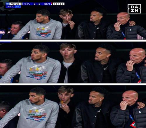 在比賽行將結(jié)束時,貝林厄姆、赫伊森、米利唐等來到皇馬替補席觀賽。當時,貝林厄姆和米利唐認真地觀看著場上的局勢,而赫伊森則悠閑地吃著食物,四處張望,好似神游物外。