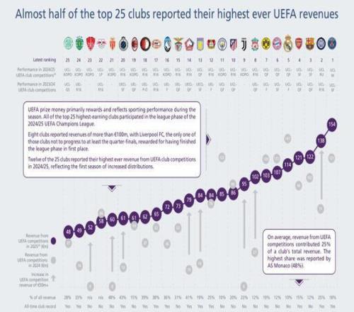 在這25家俱樂(lè)部中,有12家在2024-25賽季報(bào)告了其在歐足聯(lián)俱樂(lè)部比賽中有史以來(lái)最高的收入,這反映了分配增加的首個(gè)賽季。