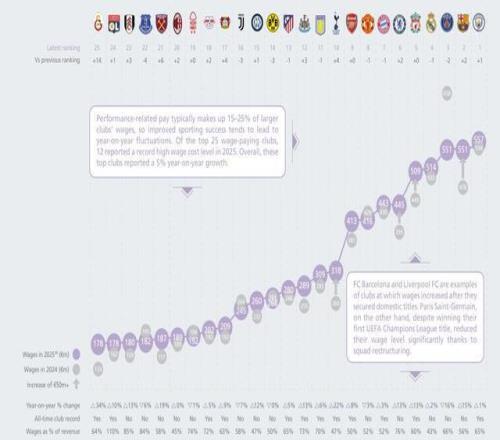 北京時(shí)間2月26日,歐足聯(lián)官方公布了2025年各俱樂部的財(cái)政與投資報(bào)告,在報(bào)告中公布了各俱樂部薪資支出的前25名,曼城以5.57億歐元的工資支出排名第一,巴薩第二,巴黎第三,皇馬第四。