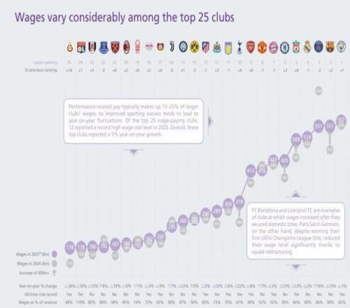 02月26報道 歐足聯(lián)公布新一期俱樂部財務(wù)狀況報告,其中涉及了歐洲俱樂部在2025年的薪資支出排名。