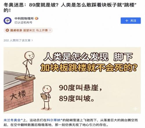 89度就是坡?人類是怎么敢踩著塊板子就“跳樓”的!面對(duì)這個(gè)“人類怎么敢踩著板子跳樓”的冬奧迷思,引得了中科院物理所的親自下場(chǎng)科普:運(yùn)動(dòng)員以高速撞向地面,速度在千分之幾秒內(nèi)降為零,作用時(shí)間極短,沖擊力會(huì)瞬間爆表——這就是為什么“90度叫懸崖”,跳下去必死無(wú)疑。