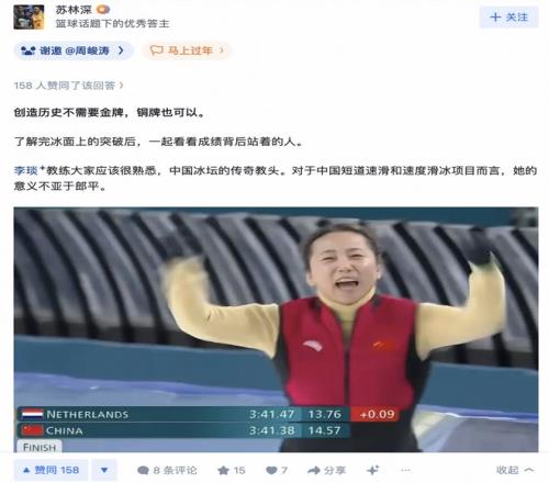 “創(chuàng)造歷史不需要金牌,銅牌也可以”,知乎答主蘇林深接著說(shuō)到,“對(duì)于中國(guó)短道速滑和速度滑冰項(xiàng)目而言,她(李琰教練)的意義不亞于郎平”。我們?yōu)槭裁磿?huì)期待短道速滑隊(duì)為我們帶來(lái)首金?就是因?yàn)樗囊槐姷茏觽冊(cè)?jīng)帶著中國(guó)榮耀站在世界之巔,王濛,武大靖,周洋……