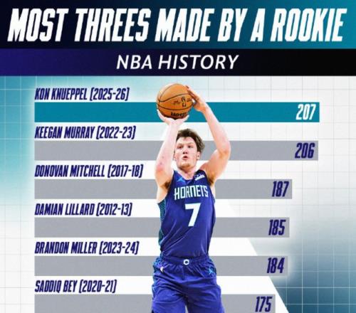 這樣一來(lái),克尼普爾的NBA生涯三分球命中數(shù)就達(dá)到了209個(gè),正式超越了薩克拉門托國(guó)王隊(duì)的基根-穆雷的206個(gè),成為NBA史上新秀三分王。要知道,克尼普爾只打了59場(chǎng)常規(guī)賽,而基根-穆雷用了80場(chǎng)常規(guī)賽。